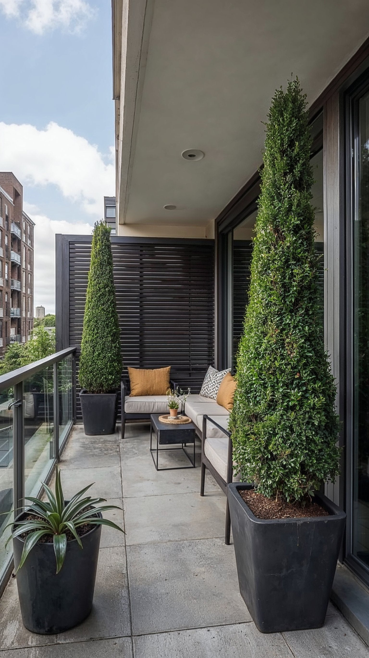 Balcony topiary positioned strategically along railings or corners provides screening from neighbouring flats without blocking light. Green architecture instead of curtains or blinds.